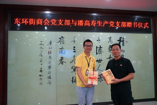 东环街商会党支部与潘高寿生产党支部还进行了互相赠书仪式。大家深有同感,党建工作做好了能为企业良性发展提供坚强保障,今后要加交流共建,互助共赢。